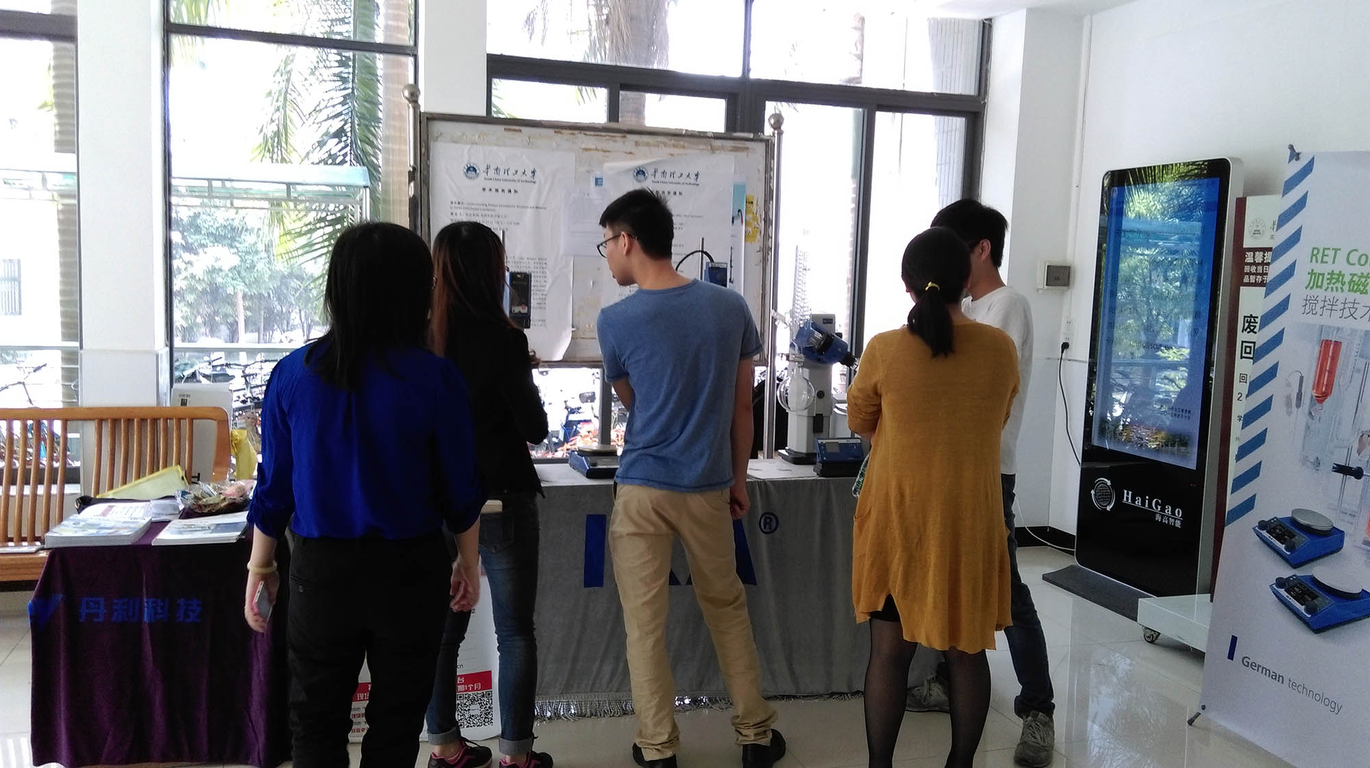 3月26日與4月16日我們分別在中山大學(xué)豐盛堂A106和華南理工大學(xué)唯美樓大堂舉辦了“丹利服務(wù)月,設(shè)備現(xiàn)場維護—校園行”活動,為吸引高校的老師學(xué)生來參加活動,當天我們提供儀器的免費維護,并給在當天下單的客戶優(yōu)惠政策。我們在活動前一周就已在校園的各實驗樓張貼好海報,派專門人員去各樓實驗室發(fā)放活動宣傳單,并登記好需要維護的設(shè)備型號。