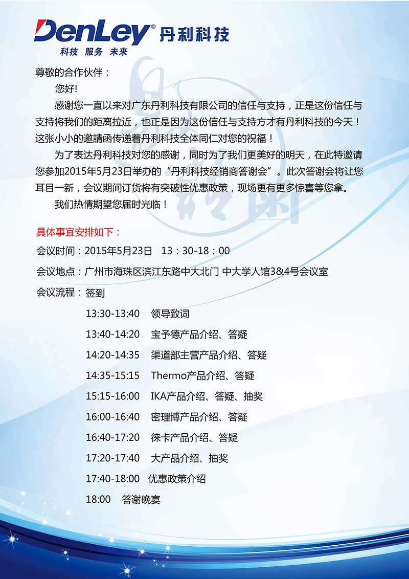 廣東丹利科技有限公司將于5月23日在中山大學北門中大學人館3&4號會議室舉辦“丹利科技經(jīng)銷商答謝會”,我們熱情期望您屆時光臨!