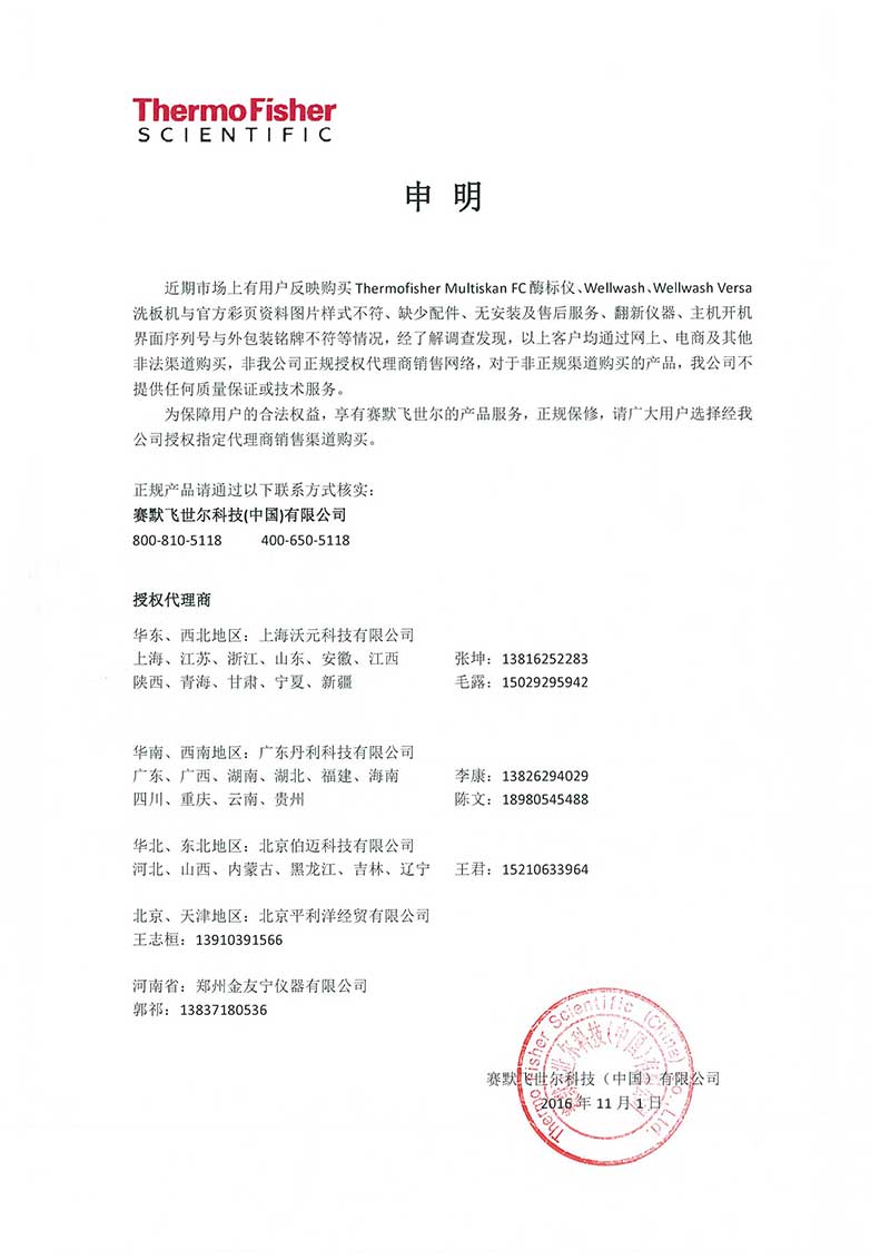 關(guān)于Thermofisher Multiskan FC酶標(biāo)儀、wellwash、wellwash Versa洗板機(jī)的重要申明