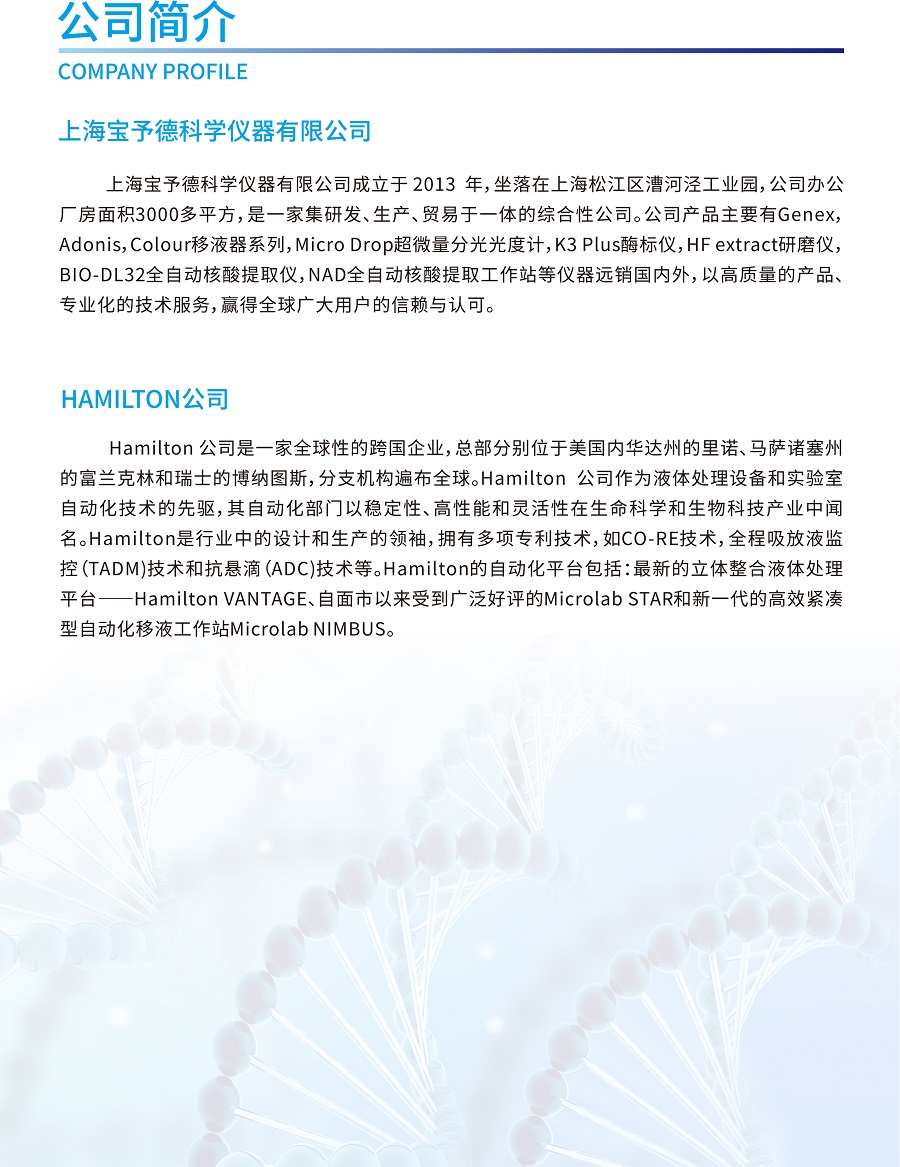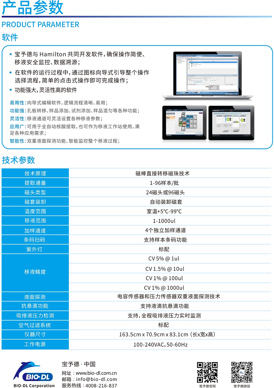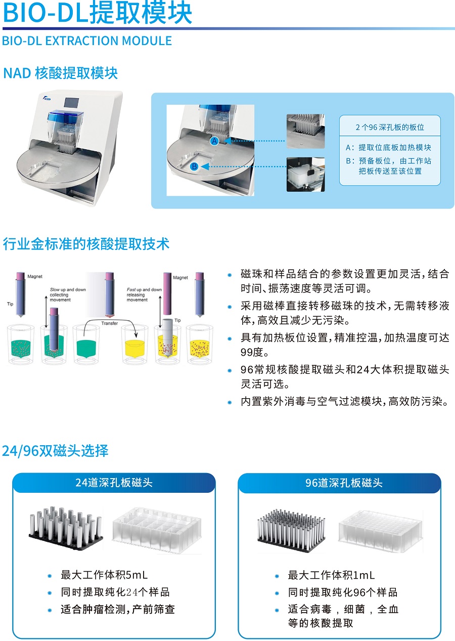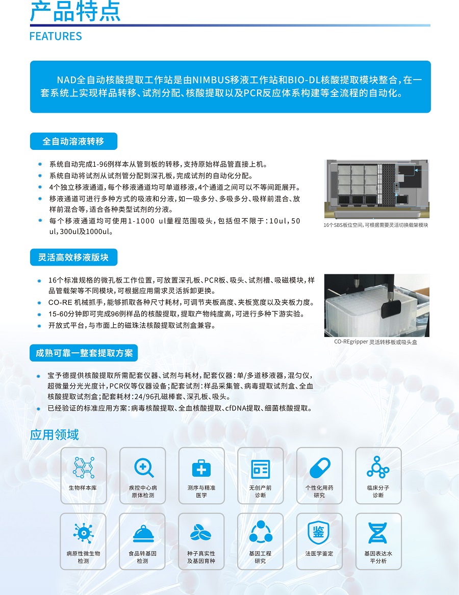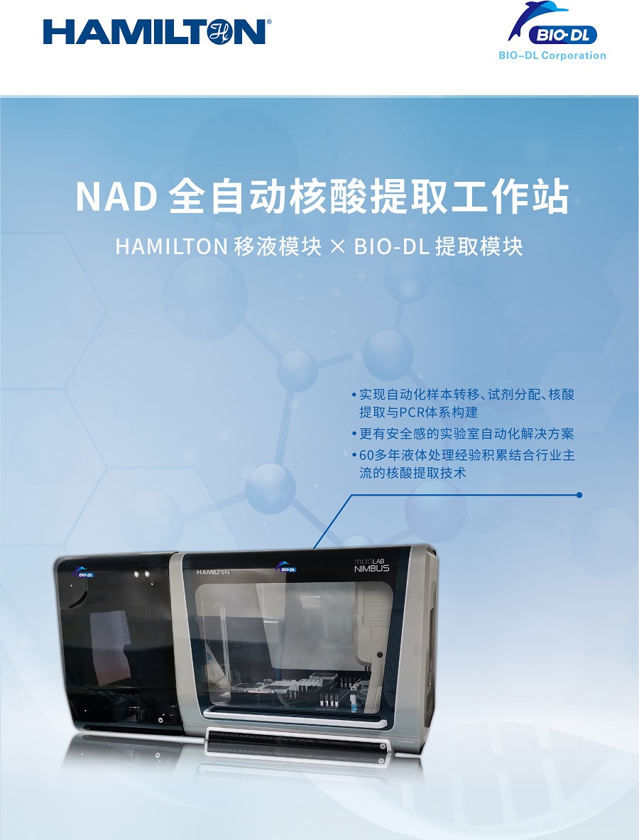 實現(xiàn)自動化樣本轉移、試劑分配、核酸提取與PCR體系構建;更有安全感的實驗室自動化解決方案;60多年液體處理經(jīng)驗積累結合行業(yè)主流的核酸提取技術; NAD全自動核酸提取工作站是由NIMBUS移液工作站和BIO-DL核酸提取模塊整合,在一套系統(tǒng)上實現(xiàn)樣品轉移、試劑分配、核酸提取以及PCR反應體系構建等全流程的自動化。